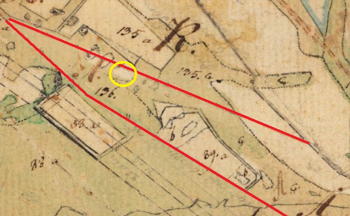 På en av kartorna från 1794 har jag ringat in bergsklacken det rör sig om. Det röda strecket överst är gränsen, och är ungefär där som vägen till vattenreservoaren går idag.