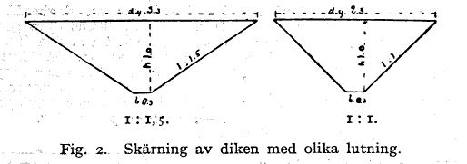 Vid ingräfning af dikesrenar, då dikeskanten ej är öfver 0,3 m. bred, bör en man hinna utgräfva 535-683 m., om jorden är tjänlig att gräfva. Är jorden hård hinnes 1/3 mindre. Ett hjon hinner 268 – 357 m.