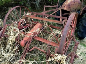 Självbindaren var i mycket bra skick. För att vara en självbindare från 1940-talet. Egentligen är väl rätt term lättbindare. Danskarna såg förbättringspotential i de svensktillverkade gjutjärnshistorierna till självbindare som var så tunga och svåra att man i stort sett endast kunde nyttja dessa om det hade varit svår torka i åtta veckor och man hade ett spann med 40 stycken nordsvenskar att dra med. Efter en undersökning som egentligen endast var en okulärbesiktning från min sida (jag kan inte så mycket om just självbindare, men hur svårt kan det vara?), genom att uppmärksamma detaljer som färg kvar på kniven och fingrarna, alla kugghjul ordentlig smorda, endast ytrost, snöre kvar i hållaren. Den enda anmärkningen är väl att det inte var luft i ena däcket. Leverantör’n kör hem den till dörren åt mig när vi har bestämt ett datum.