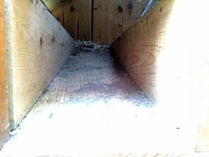 På ena långsidan finns en lucka. Jag har inte riktigt funderat ut vad som kommer att ramla ut ur rännan vid rensning. Kanske ogräsfrön? Vad jag vet däremot är att säden kommer ut på ett helt annat ställe. Denna lucka finns inte på vårt gamla rensverk.
