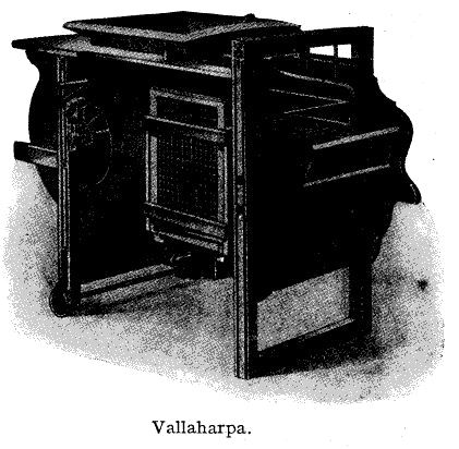 »Kastmaskinen» är försedd med en inmatningstratt, som är något olika, allt efter som bossblandad säd, sådan den kommer från det enkla tröskverket, skall rengöras eller redan kastad skall luftas och befrias från mindre mängd föroreningar. I det förra fallet, på logharpor, befordras den bossblandade sädens utströmning vanligen genom att tratten är öppen framtill och fäst på sållställningen, så att den deltar i dennas skakande rörelse, eller ock faller säden från tratten på en överst i sållställningen anbragt kam av kvarterslånga järntrådar, som fördela säden över sällen. Hos magasinsharpor, för säd, som redan är befriad från boss och agnar, brukar tratten vara orörlig, fäst på maskinens stomme, och utloppets storlek regleras genom en ställbar lucka. Sällen äro anbragta i en sållställning, som är rörligt upphängd i maskinens stomme och sättes i skakande rörelse medels en vevstake och vevskiva från den axel, varmed även fläkten drives. Genom vevstakens anfästning på olika avstånd från vevskivans axel bör skakningen kunna regleras till olika hastigheter i förhållande till