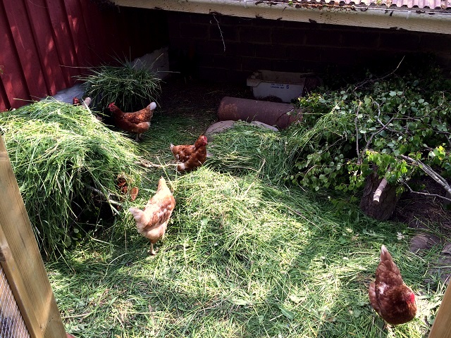 Sen slog vi lite gräs och jag hämtade björkris och piffade upp hönsgården.