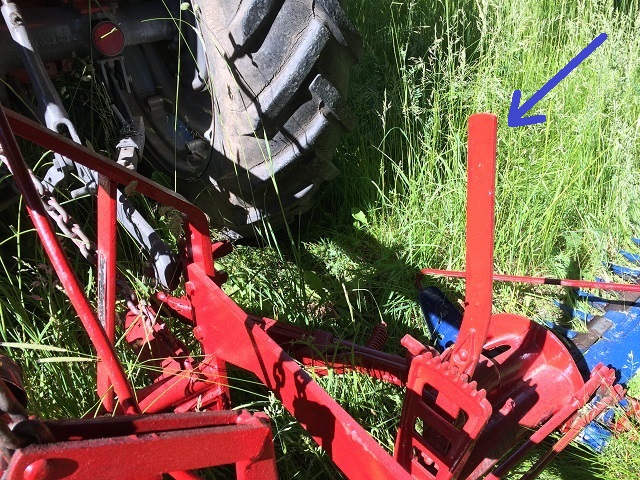Balken skall ligga horisontellt med marken. Gör den inte det – som i bilden nedan – måste man justera lyftkedjan som sitter fast mellan lyftarmen och toppstången.