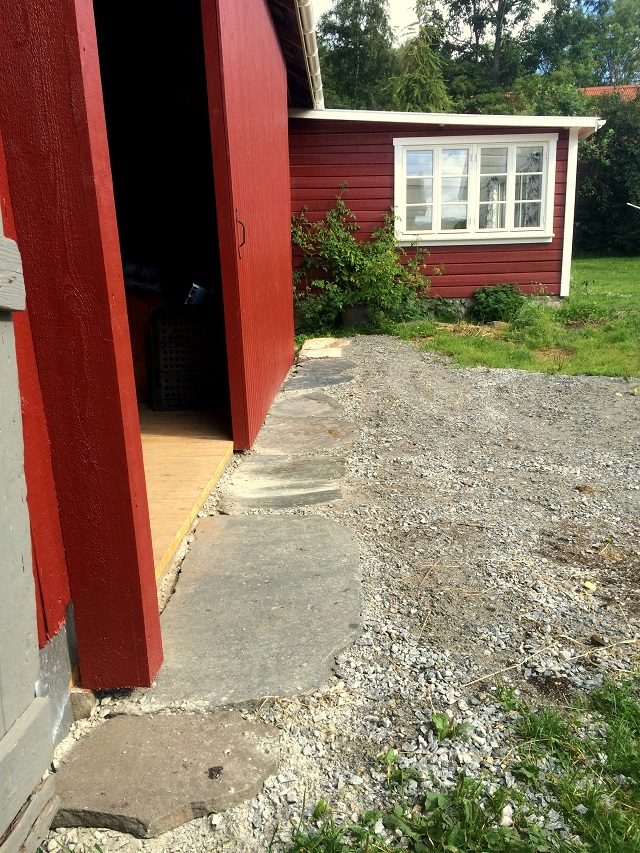 Eftersom halmmagasinet/vedbon gick hädan i början av året och det byggdes ett uterum på platsen, såg det lite tomt ut på plätten framför skjutporten. Det var att bege sig till utmarkerna och leta efter stenhällar. Efter att ha hittat ett par passande så började vi gräva och fick användning för gruset som blev över.
