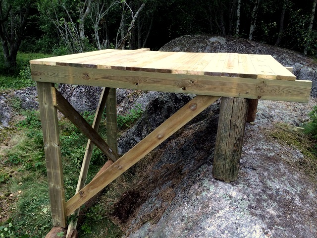 Förra året sålde brädgår’n ut en del billigt tryckt virke. Det har legat i brädladan sedan dess i väntan på bättre tider. Vi har pratat om att ha ett nytt jakttorn fågelskådartorn i Elins hage. Efter att ha gått omkring och funderat var tornet skulle passa bäst, hittades tillslut en bra bra plats. Diverse rönn fick gå hädan för att bereda lite mer plats, sedan var det bara att sätta igång. Det är jobbigt att bygga på sned mark, men efter diverse kraftuttryck började det likna något – både i lod och i våg.