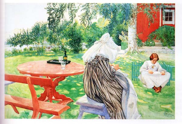Gräsplaner skall slås var fjortonde dag samt vattnas rikligt vid torka. Frö av två och fleråriga växter sås i början av månaden, om detta inte redan skett. De två och fleråriga växter som man sått på våren, skall omplanteras, helst på särskilda sängar, eftersom dom inte blommar detta år. Först på senhösten eller påföljande år skall dom planteras på de ställen som de skall blomma.