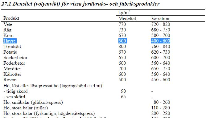 Om vi tar ett snittvärde på 550 kg per kubikmeter havre, får vi 550 x 17,4 = 9,5 ton. Bra.