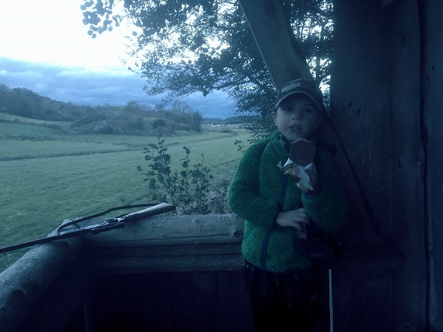 På kvällen ville Wiggo ”gå ut och jaga älg, som pappa gör”. Jag var trött efter att ha bränt 1500 kcal efter att ha gått 1 mil med full packning och bössa, men efter en kopp kaffe piggnade jag till, och jag och Wiggo gick till Kalvhagen och satte oss. Wiggo hade packat ner mjölk och kexchoklad som proviant, och åt upp denna, ivrigt pratande om älgar, rådjur, rävar, säd, traktorer, Ninjago, skolan och allt mellan himmel och jord, på en 5½ årings snusförnuftiga sätt. Vi satt och tittade på tre rådjur och diskuterade vad vi skulle göra, det slutade med att jag förklarade att man måste inte skjuta allt som rör sig. Sen gick vi sakta hem i skymningen.