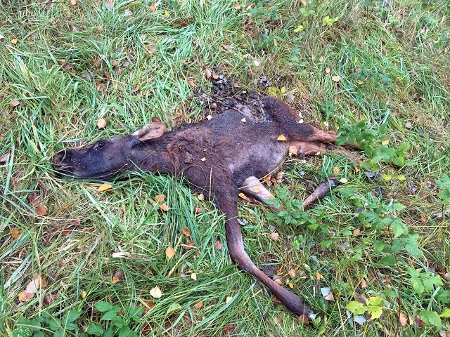 Jag blev nyfiken och gick bort till det svarta i gräset. Jodå, en liten älgkalv. Fortfarande brun på bakbenen. Efter lite obducerande kom jag fram till att kalven verkar ha blivit ihjälstångad av en älgtjur. Kalven har blivit född sent på året och troligen gått tillsammans med en ko. En älgtjur har attackerat kalven (stickstår i bröstet), kalven har tillslut dött. Det var vuxen älgspillning bredvid kalven så kon har stått kvar och väntat på kalven innan hon gett sig av. Älgtjurar gör på detta vis ibland för att kon skall brunsta om och kunna betäckas på nytt av tjuren.