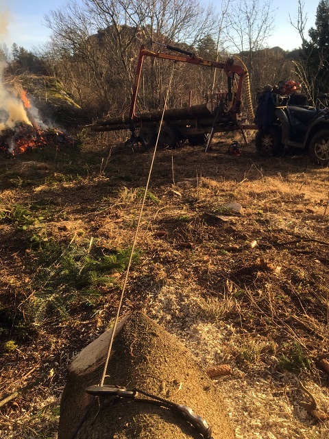 Dagen fortsatte med grillning, kaffe, att fälla mera träd och att elda.