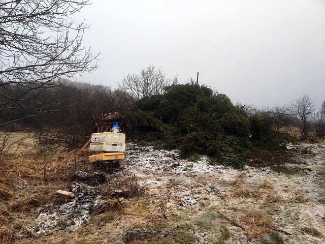 Det var fruset på marken så det var bra bärighet utan risk för körskador. Vi höll på till arla kväll och lade upp en hyfsad stuv i hagen.