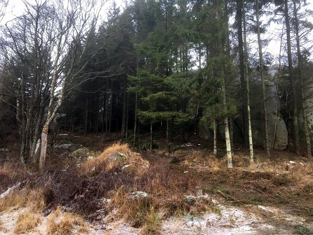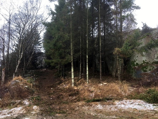 Denna dunge med granar planterade morfar’n och Holger på 1990-talet (’92/’93). För ett par år sedan gjorde jag en lätt gallring genom att ta bort döda granar och kvista en del. Men eftersom jag och Holger tänkte såga virke behövs det träd. Granarna är ungefär 25 meter höga.