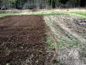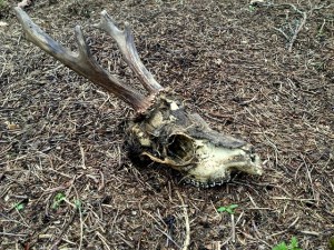 Efter sådden provkörde jag och Wiggo jordfräsen. Det var lite för vått i marken, men på det stora hela fungerade det ganska bra. Det får gå en-två-tre veckor till innan man kan börja jordfräsa och harva på riktigt. Runt första maj brukar var en riktpunkt. Vi fräste i Elins hage samt den lilla skogslyckan i Holgers hage där vi förra året satte potatissorten Gwenne. Istället för att det inte kommer att växa annat än skid uppe bland träden i den lyckan, kan man väl lika gärna så något för att hålla det snyggt? Kanske en lite viltåker? Om det inte blir potatis i år igen. Bredvid denna lycka ligger en schwjår myrstack. Huvudet från råbocken jag skjöt i fjol blev till övervintringsmat för myrorna. Det var rätt renrakat, så jag passade på att ta hem det (jag har glömt det de senaste tio-tolv gångerna jag varit i hagen).