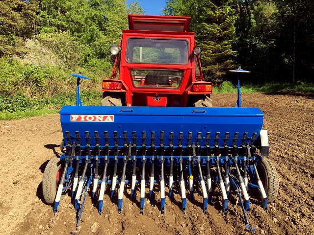 Efter att ha harvat en slät såbädd, medans barnen sprang omkring i gräset, körde jag hem och bytte harven mot den nya såmaskinen. Maskinen blev rätt snygg efter en viss renovering, och jag smorde upp dreven och läste manualen (på danska) en sista gång innan jag körde tillbaka till Wiggos hage. Jag hade beräknat den harvade viltåkern till ungefär 1100 kvadratmeter (runt 0,1 hektar) och jag prövade att ställa in såmaskinens växellåda på maximal inställning för havre, runt 250 kilo per hektar. Det borde alltså gå åt ungefär 25 kilo havre på 0,1 hektar.