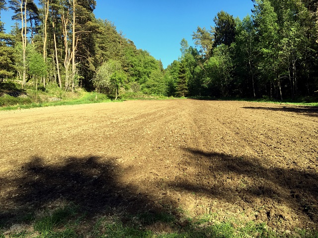 Vårbruket var inte färdigt, och på lördagen var det dags att byta ut harven mot jordfräsen, för att åter styra kosan mot utmarkerna och ”Lycka’ i Sandwhigedarl’n”. Wiggo och jag tog en promenad i skogen medans Holger förberedde såbädden. Wiggo hittade och studerade med stort intresse två paddor och en ormslå (kopparödla). Först trodde Wiggo att det var en orm, och undrade om vi inte skulle ta och slå ihjäl den? Men jag förklarade att dels är det ingen orm, utan en ödla, och dels är alla ormar i Sverige fridlysta. Enda undantaget är om man påträffar en huggorm på tomten, då är sista utvägen att ha ihjäl den, om man inte lyckas flytta den.