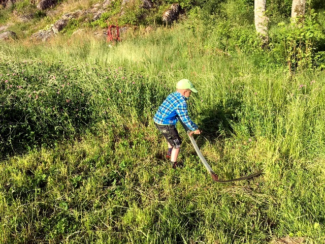 För några dagar sedan skrev jag om Wiggo och lien. Efter att ha hittat ett gammalt lieblad, som passade till en ännu äldre orv, har Wiggo äntligen fått sin egna lie. Givetvis får han inte använda den själv utan att någon vuxen är närvarande. Efter några hundra svingar börjar Wiggo nu få in det rätta greppet och gräset faller som efter den värsta slåttermaskin.