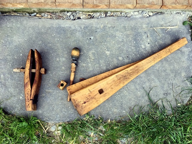 För några dagar sedan klättrade jag upp på rännet i koghuset (brygghuset) och rotade efter gamla verktyg till mitt pågående konstprojekt. Jag samlade ihop de hyvlar som hittades, och har avsatt tid då och då till rengöring och varsam renovering av dessa. Igår kväll stod jag och slipade bort det värsta dammet från hyvlarna, allt medan Elin satt en bit bort och schwasschla‘ (plaska) i en gammal balja (som används till allt från att bära tvätt i till att ha som slaktback).  När jag var färdig med rengöringen hämtades linolja. Träet drack girigt av oljan och efter första strykningen syntes det knappt att jag alls oljat. Träet var helt torrt, och ytterligare en strykning krävdes innan det började se någorlunda bra ut.