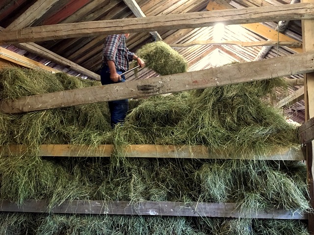 Eftersom vädret skulle vara fint hela dagen, orkade jag inte äntra mer med hö idag. Istället lade vi ut skulltork-bottnarna i ladan så att höet skulle få en ordentlig luftning där det skulle komma att ligga lagrat. Sedan lossade vi spannmålskärrans 56 stycken balar och bar upp på rännet.