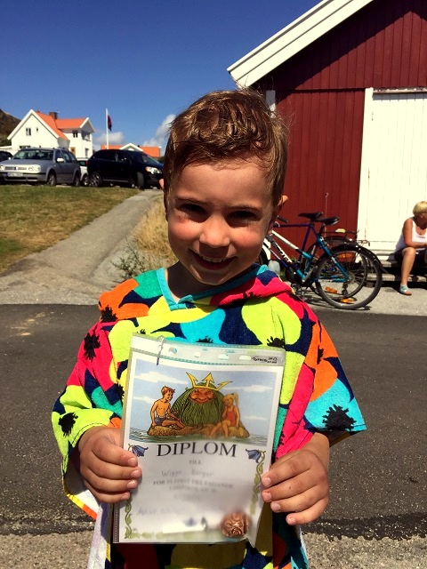 Tillslut kom dagen när Wiggo fick sitt avslutningsdiplom. Jag kunde inte låta bli att fnissa för mig själv, när jag insåg att jag fick ett exakt likadant diplom när jag avslutade min simskola för längesedan. De måste ha en bra hög liggandes inne i bua, eftersom inte ens design eller typsnitt ändrats det minsta.