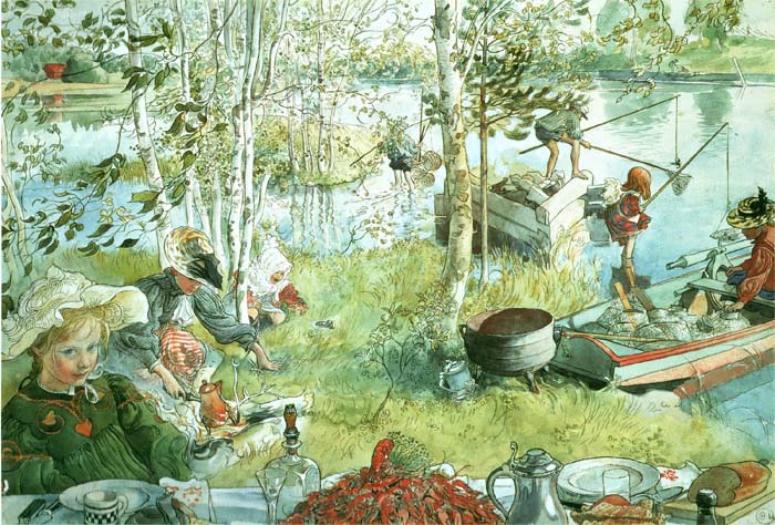Föregående månads arbete fortsätter. Man bör vara särskilt uppmärksam på kålmasken, som skall förföljas och utrotas så snart den visar sig. Angående frösådd gäller samma som föregående månad. Fleråriga köksväxter som rabarber, gräslök, syra, dragon med mera delas och planteras om. Löksorterna tas upp, så snart bladen gulnar i topparna och läggs på en luftig vind till torkning. Man börjar samla in frö till köksväxterna. Så fort ett land, på vilket man skördat tidiga ärtor, rödlök eller liknande blir ledigt, skall man gräva upp det, för att det ogräs som eventuellt finns inte skall hinna sätta frö. Helst skall man också gödsla landet och gräva ner gödseln omedelbart efter skörd.