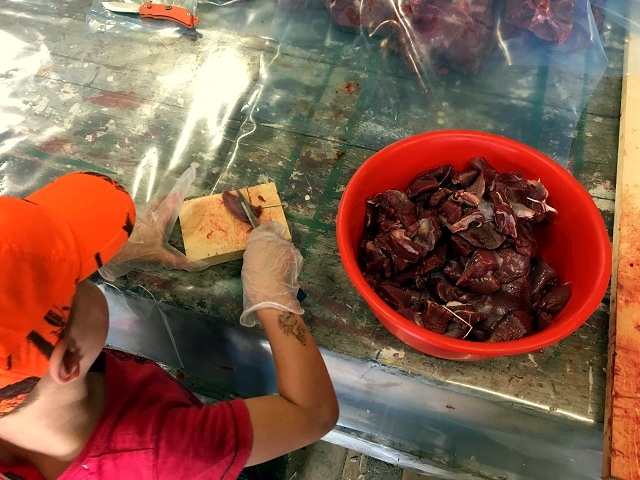 Även nu ville Wiggo vara med och hjälpa till. Bockarna (vi skjöt en till på torsdagen) hämtades. Knivar och redskap tvättades ordentligt. Plasthandskarna träddes på nävarna och styckningen påbörjades. Wiggo fick öva på att skära kött i småbitar och lägga i en bunke. Sedan fick han gå in och mala köttfärs av bitarna.