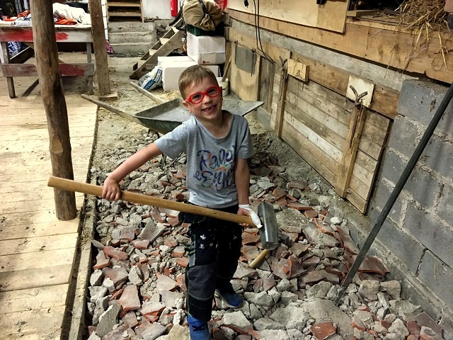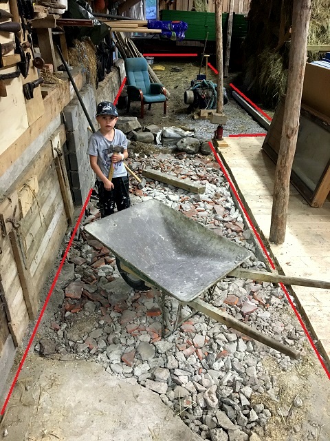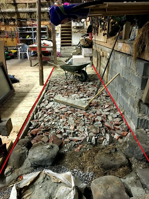 Här är den del av den gamla logen som skall göras om, vy åt söder. Spett och slägga bryter sönder den gamla betongen bra. De stora stenarna i bildens nedre kant var avgränsningen mot löshöet förr. Det var även i detta mörka hörne jag hittade det gamla tröskverket och rensmaskinen.