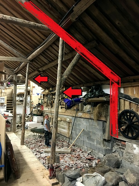 För att få ordning här, behöver ett par gamla stöttor tas bort. Detta löses genom att vi har sågat till ett par riktigt rejäla sexmetersplankor som kommer att sättas under taksaxen, sedan ner till en ny stötta i väggen.