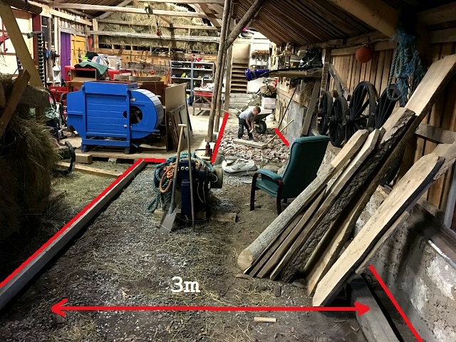 Den nya klacken kommer att bli tre meter bred och sex – sju meter lång. Det exakta måttet är ännu inte bestämt. Det blir ungefär 10 kubikmeter med betong som går åt. Vi får ta och hämta ett par traktorkärror med sand och makadam samt armeringsmattor och cement, så att allt finns på plats innan man drar igång själva gjutningen.