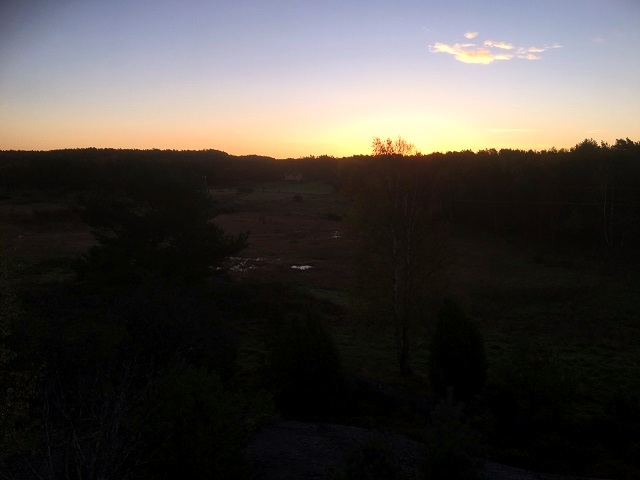 Per satt i Wiggos hage och Holger i Elins hage. Roger satt i Moltemyra och Daniel vid ”Slottet”. Det var i vanligt ordning en del älgspår, dock mindre än vanligt, och nästan ingen färsk spillning. Runt klockan nio small ett skott i fjärran, grannlaget hade fällt en älgkalv. Det var det enda som hände på hela dagen. Runt halv ett samlades vi för att grilla hos Henrik och Ann-Marie, som bjöd på pyttipanna lagad över öppen eld. Mycket gott. Jag bröt tidigt på eftermiddagen och hämtade på dagis.