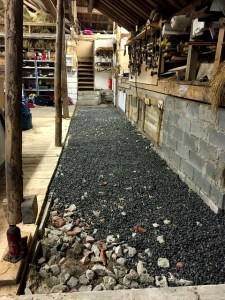 Makadam i botten för att slätta till. Sedan läggs rör vid den högra väggen, i nivå med trälogen för att ha något att dra brädan på vid gjutningen