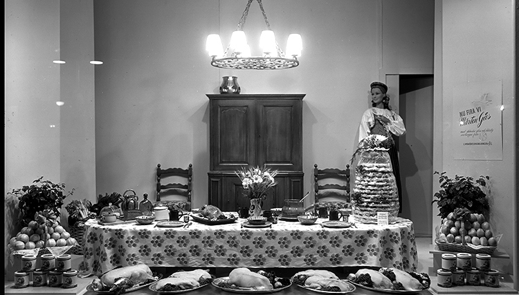 NK:s skyltfönster november 1948, ”Nu fira vi Mårten Gås”. Borden är dukade med vad som ska se ut som tillagad gås och spettekaka. Som på väg in i rummet, en skyltdocka klädd i folkdräkt. På väggen ett anslag med texten ”Nu fira vi Mårten Gås med skånska gäss och härlig svartsoppa från NK:s livsmedelsavdelning”.