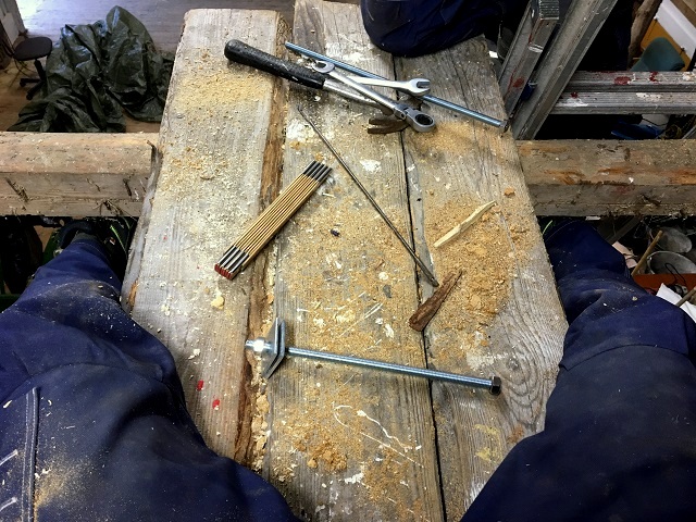 Tumstock, fasta nycklar, hammare, borr, gängstänger, brickor och muttrar. Allt man behöver för att förstärka en takstol. Här sitter jag på den tillfälliga byggnadsställningen, 3 meter upp.