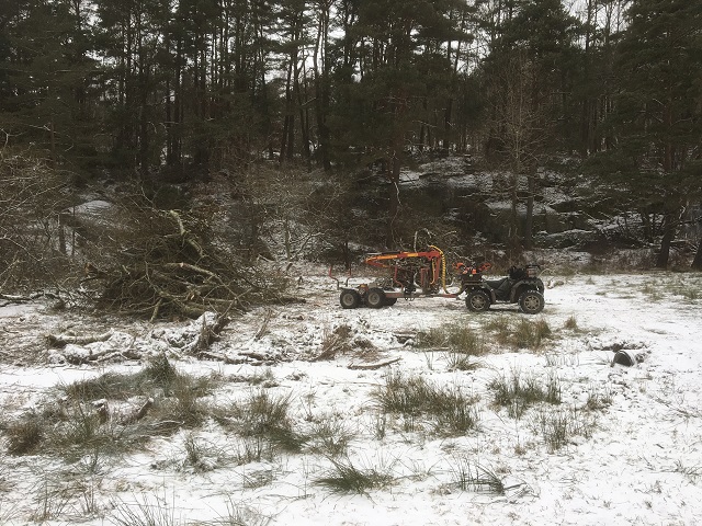 Vi hade kommit en liten bit på väg i röjandet av buskaget i Wiggos hage. Innan röjningen påbörjades,  sträckte sig sälgen lite framför fyrhjulingens framdäck, bort till berget och hitom kameran. Alla grenar gick givetvis i varandra så man fick dansa menuett med motorsågen. Trampade igenom isen en gång och fick hem och byta byxor och stövlar.