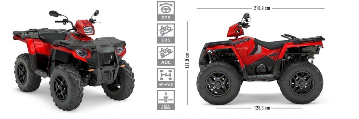 En sak som gamla fyrhjulingen hade var Active Decent Control, ADC, vilket automatbromsar alla fyra hjulen om man kommer nerför en sluttning med en tung kärra efter, typ vår griplastarkärra. EPS är utrigiska för servostyrning, och toppmodellen av Sportsman har MacPherson-fjädring, dvs delad bakaxel och dubbla A-armar med 241 mm fjädringsväg.