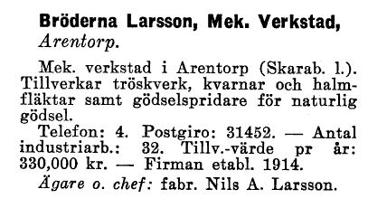 Ännu ett – helt onödigt – projekt att roa sig med. Visserligen finns det inte så många av dessa mekaniska tingestar kvar, och absolut inte i detta skick med tillhörande originalskylt och allt. Företaget Bröderna Larsson i Arentorp AB grundades i 1914 av bröderna Nils Larsson och Gustav Larsson. De första åren tillverkade man enbart tröskverk som gick under namnet Skandia Tröskverken och kunderna var främst närliggande gårdar. Under 1920-talet utvecklade man de första självrensande tröskverken, vilka skördade (!!) stor framgång för bröderna Larsson. Efterfrågan på Skandias tröskverk ökade under åren och 1945 tillkom en produkt i sortimentet, nämligen gödselspridaren.