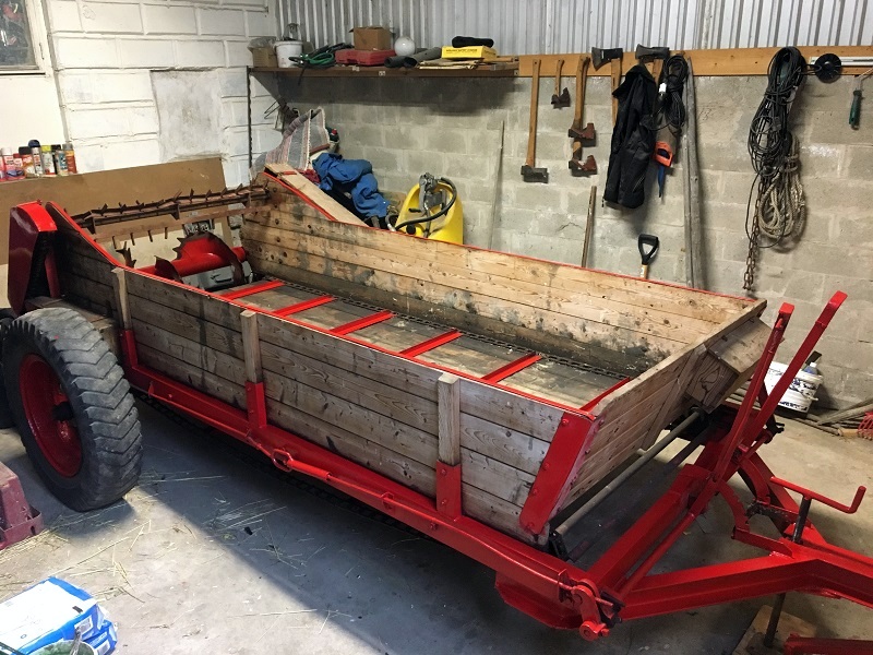 Efter att maskinen fått stå ute i regnet under någon vecka, drog jag in den under tak i verkstan’ och satte igång. Det är inte helt färdig ännu, men man börjar skönja en viss förändring. Spridaren är markdriven, vilket betyder att vid det vänstra hjulet sitter det ett enormt kugghjul man via en spak lägger an en kedja. När kedjan ligger an, rör sig lite kugghjul och drev vilket driver valsarna och kedjorna i botten på spridaren. Dyngan rör sig bakåt mot valsarna och sprider ut skiten över åkern.