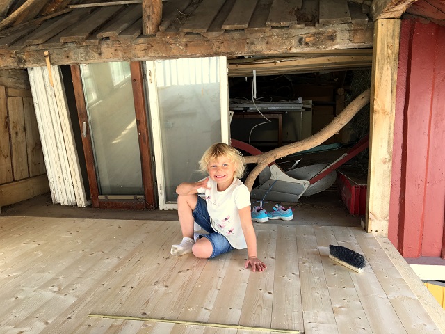Elin var gärna med och hjälpte till. Fönsterna och plogarna i bakgrunden skall väck. Vissa ska till soptippen, vissa blir omlokaliserade på går’n.