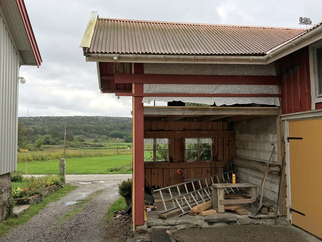 Sedan var det dags att städa undan gamla fönster m.m, och när det var gjort sågade vi upp taket mellan brygghuset och ladan och öppnade upp tillräckligt för att kunna sätta in en gammal spegeldörr (som legat och vilat i många år på ett ränne).