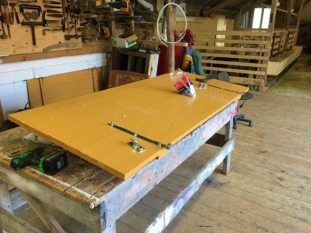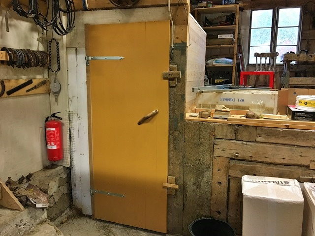 Lite senare var 1 tums, spontade granbrädor införskaffade – samma virke som golvet i kokhuset, och jag letade upp färghinken med gullockra’. Det kanske är att ta i med 1-tums hård gran, men det kan vara bra att ha, dels för isoleringens skull, samt att dörren borde stå pall ifall tuppen blir förbannad och försöker sparka sig ut.