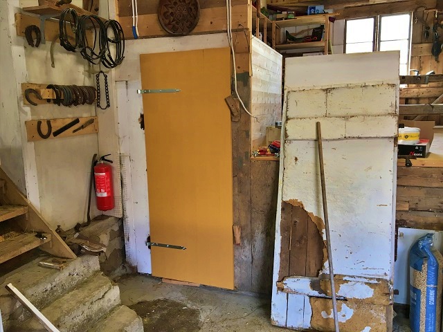 Den gamla dörren målade jag vit för många år sedan. Jag minns inte vilken färg det var från början. Kanske naturfärgad? Kanske falu-röd? Den var i varje fall konstruerad av spontat virke typ innertak, med påspikad dåtidens ASFA-board som isolering. För en del år sedan byggde vi om nergången till stallet. Sett ur den aspekten var folk inte riktigt kloka förr i tiden! Vad hade det spelat för roll att lägga på en, enda stock till? Allt skulle sparas på och vara så lågt i tak som möjligt. Dörren fick en tillfällig höjning i form av en plyfaskiva.