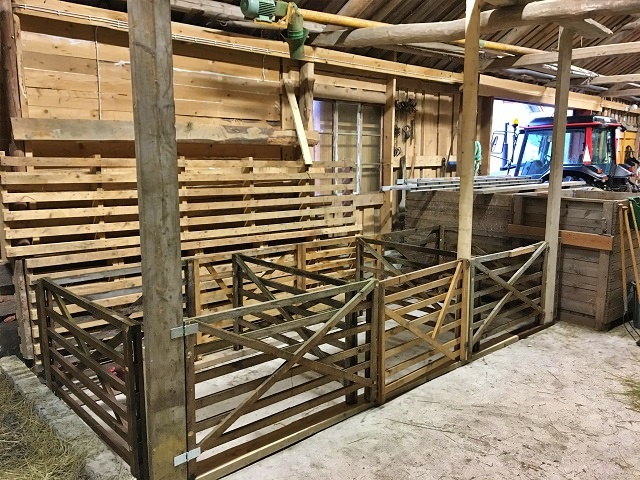 Lammboxar. Det hade jag glömt bort att ordna. Skruvade ihop några olika konstruktioner med olika mått, men inget blev speciellt bra. Som tur är har vi en snäll granne som villigt lånade ut sina egenhändigt tillverkade fårgrindar. Och sen bar det iväg. Plankor i botten, tre boxar på 1,5×1,5 meter, letade reda på gamla gångjärn och gjorde grindar till boxarna. Kanske lite överkurs. Men det blev rätt snygg.