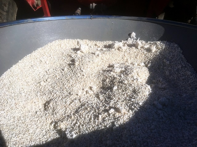 Konstgödselspridaren laddad och redo. Maskinen består av en tratt med en roterande skiva längst ner. Skivan sprätter ut granulatet beroende på hur fort man kör, och vad man har för inställning på öppningen. Jag brukar köra på hög etta med varvtal 540 rpm samt öppningen på läge två. Då sprätter granulatet iväg ungefär två meter åt vänster, höger och bakåt.