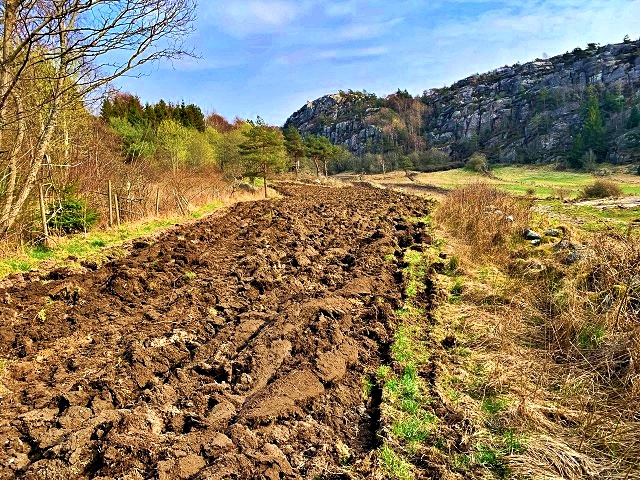 Vy från infarten till Elins hage. Det ser ut som en skock med brunstiga vildsvin gruffat omkring i hagen, men huvudsaken är väl att jorden blev vänd…