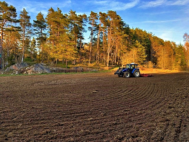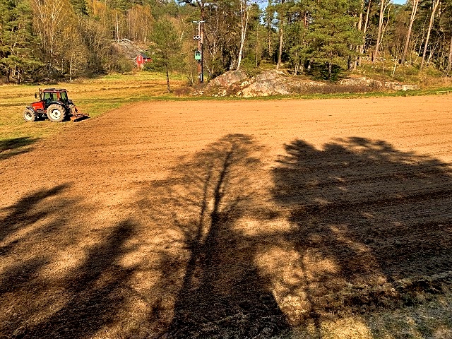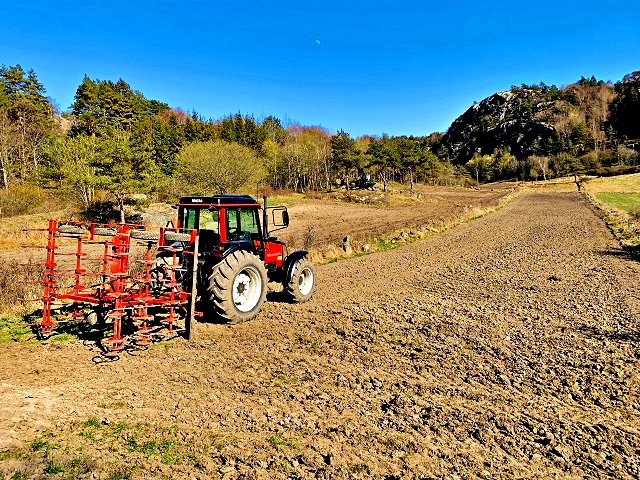 Att harva isär en gammal vall som inte blivit plöjd på minst 60 år, är rent ut sagt ett riktigt helvete. Man harvar, harvar, harvar och harvar till man håller på att bli tokig. Sen harvar man lite till för att slätta till alla gamla hålor och plogfåror. I slutet av harvningen körde Holger på konstgödsel, NPK.