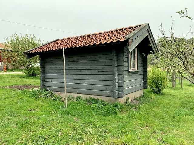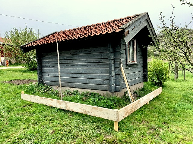 Här skall en pallkrage byggas. Blev återigen påmind att såga till och byta vindskivorna. Hässjestören var tänkt att i fjol bli en humlestör men torkan hade ihjäl all humle, trodde jag. En planta klarade sig! Den kommer säkert i år!