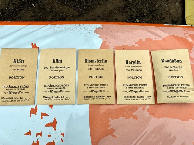 Jag har haft en fundering på att odla något roligt, men kom inte på vad. Gråärten och bonbönorna är sådda, och jag var sugen på något färgsprakande och grannt. Efter lite slösurfande på nätet beställde jag Klätt, Klint, Blomsterlin, Berglin och en gammaldags sort Bondböna. Fast jag hade ingen bra plats att så på. Vårbruket var ju redan färdigt. Det kanske hade passat att ha en pallkrage vid stockehuset? Ja, varför inte? Gammalt virke i form av plankor hämtades och en pallkrage konstruerades. Jord hämtade jag från en åker och snart var pallkragen fylld. Förr i tiden så ansågs flera av dessa sorter som ogräs och bekämpades både genom mekanik och besprutning.