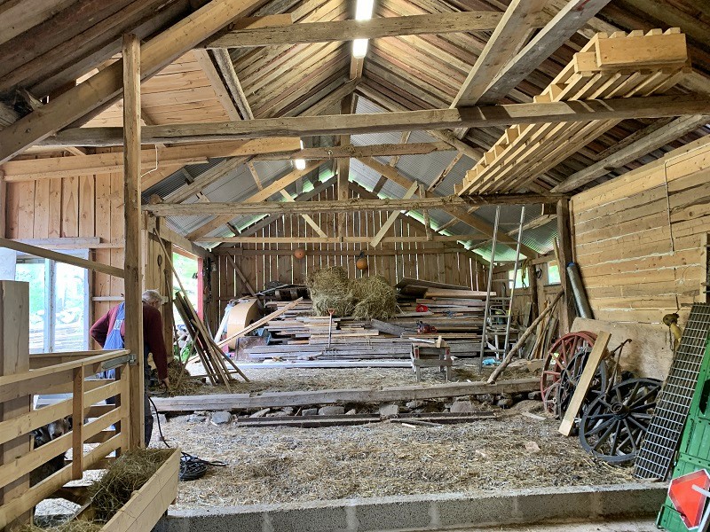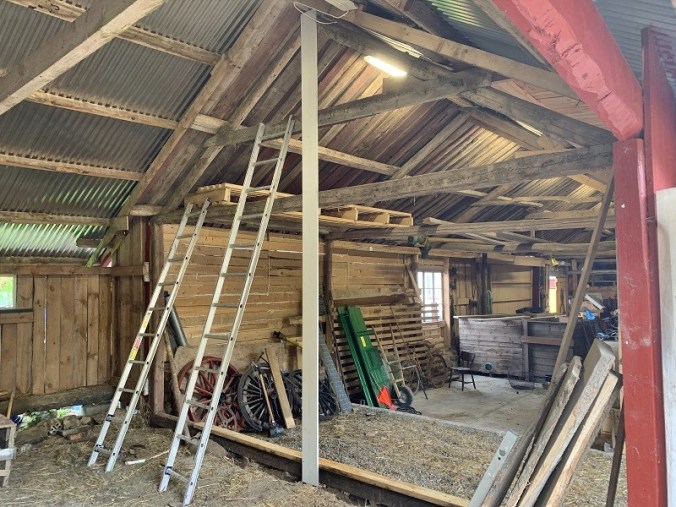 På 1980-talet byggdes norra gaveln ut ytterligare, till ett garage för att husera självlastarvagnen (användes vid höskörd). När vi slutade med djuren 1990/91, såldes självlastarvagnen och garaget blev ett virkeslager/bra-att-ha-lager. På senare år har vi haft fyrhjulingen, virke och höbalar i norra gavel. Flera gånger har jag haft en idé om att få fason på den gamla sneda och vinda väggen, och nu blev det äntligen av.