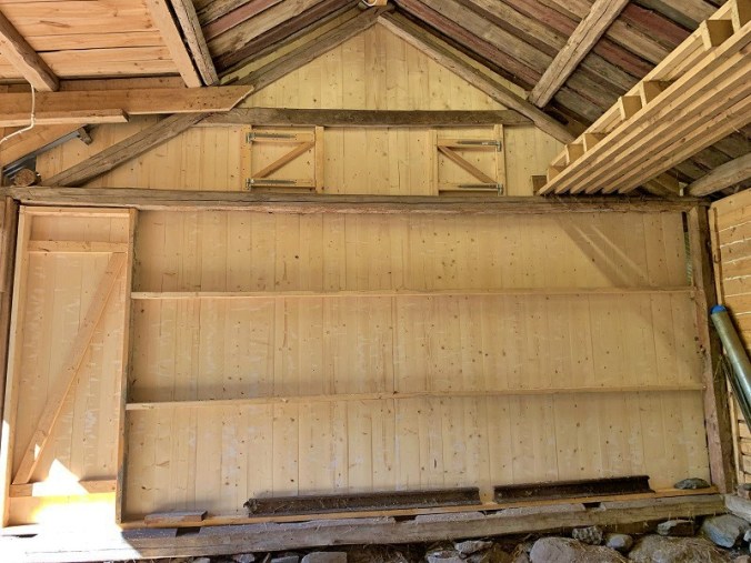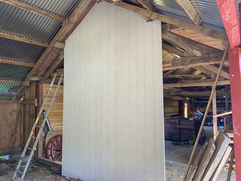 Väggen klar. Dörren öppnas utåt, luckorna öppnas inåt. Orsaken till luckornas öppning är att på andra sidan väggen kan man i nödfall lagra hö- eller halmbalar