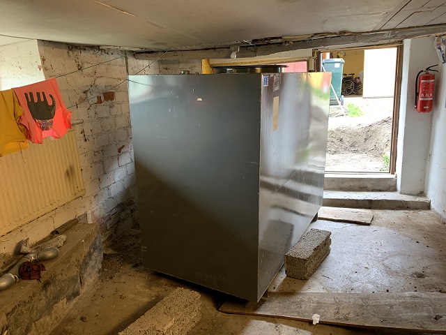 För runt 20 år sedan var det dags att byta oljetank. Från att i 50-60 år ha haft en oljetank utomhus i trädgården, flyttades en ny tank, som rymde 3 kubikmeter olja, in i källaren. Jag vill minnas att det var precis att det gick att få in åbäket. Och nu var det alltså dags att försöka ta ut tanken igen.