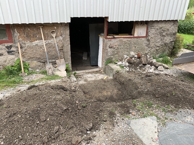 Efter fyra timmar var tanken ute på gårdsplan. Återstår att sätta upp källardörr, karm, fönster och mura upp några trappsteg.